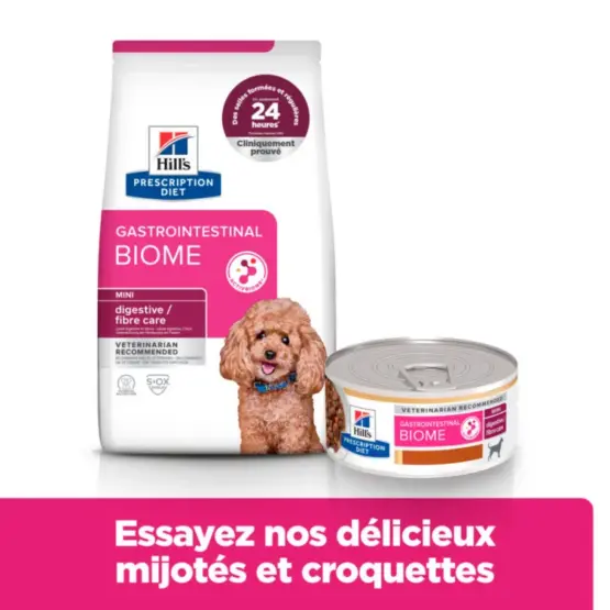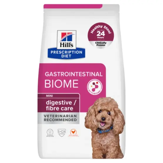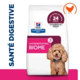 L’aliment pour chien HILL’S PRESCRIPTION DIET Gastrointestinal Biome Mini au poulet a été spécialement formulé pour répondre aux besoins des chiens de petite taille ayant des troubles digestifs.