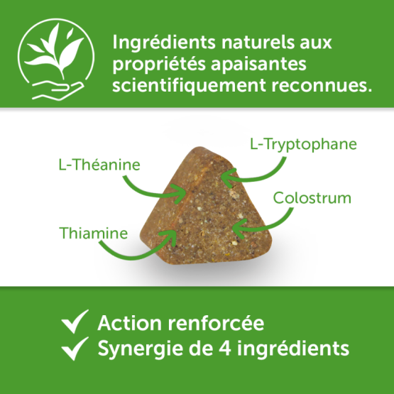 • Solution naturelle scientifique prouvée : Synergie de 4 ingrédients naturels aux propriétés apaisantes scientifiquement démontrées : L-théanine, Thiamine, L-tryptophane et colostrum.