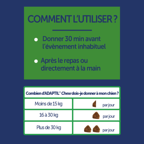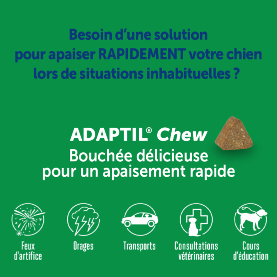 ADAPTIL Chew est un aliment complémentaire destiné à calmer rapidement les chiens lorsqu’ils font face à des situations stressantes.