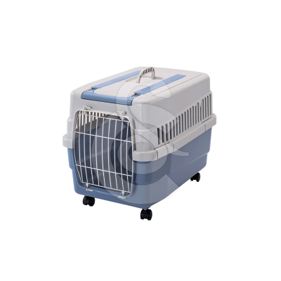 Caisse de transport pour chiens et chats, équipée de petites roulettes pour sol dur et régulier.
