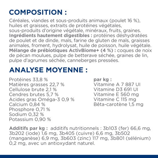 Céréales, viandes et sous-produits animaux (poulet 16 %), huiles et graisses, extraits de protéines végétales, sous-produits d'origine végétale, minéraux, fruits, graines. Ingrédients hautement digestibles : Protéines déshydratées de poulet et de dinde, maïs, farine de gluten de maïs, graisses animales, froment, hydrolysat, huile de poisson, huile végétale. Mélange prébiotique ActivBiome+ (4 %) : Coques de noix de pécan moulues, pulpe de betterave séchée, graines de lin, pulpe d'agrumes séchée, canneberges séchées.
