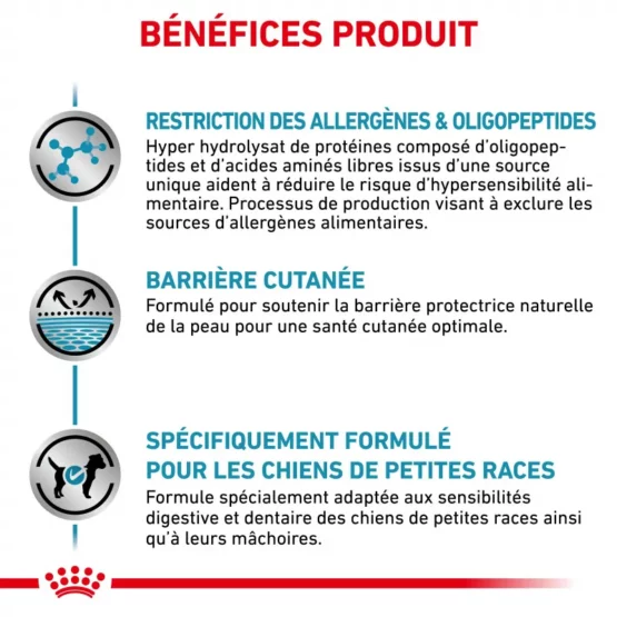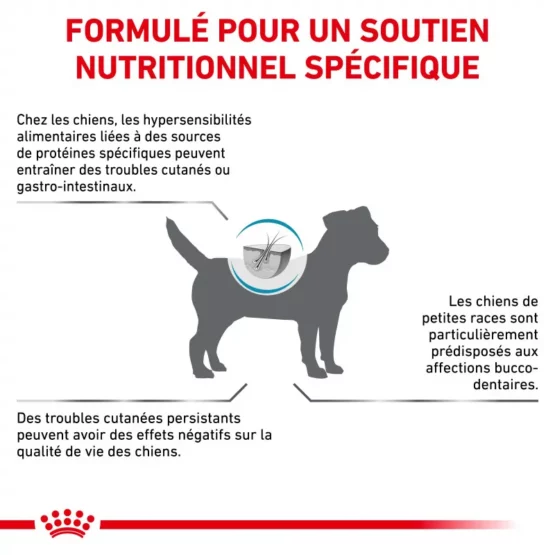 Aliment complet pour chiens formulé pour réduire les intolérances alimentaires dans le cadre d’un régime d’éviction. Taille des croquettes adaptée aux petits chiens.