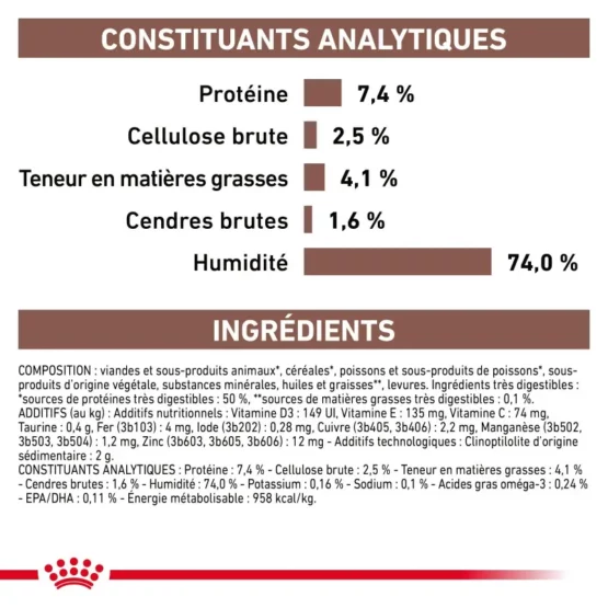 COMPOSITION : Viandes et sous-produits animaux**, céréales**, poissons et sous produits de poissons**, sous-produits d’origine végétale, substances minérales, huiles et graisses***, levures. **sources de protéines très digestibles : 50 %, *** sources de matières grasses très digestibles : 0,1 %.  ADDITIFS (AU KG)**** : Additifs nutritionnels : Vitamine D3 : 149 UI, Vitamine E : 135 mg, Vitamine C : 74 mg, Taurine : 0,4 g, Fer (3b103) : 4 mg, Iode (3b202) : 0,28 mg, Cuivre (3b405, 3b406) : 2,2 mg, Manganèse (3b502, 3b503, 3b504) : 1,2 mg, Zinc (3b603, 3b605, 3b606) : 12 mg. **** Values reflect only levels added to the formula, not those naturally occurring in components of the diet. For total levels in the diet, refer to the Average Analysis pages.