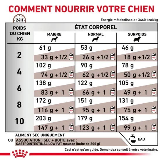 Royal Canin Dog Gastro Intestinal est un aliment complet, équilibré, réduit en matière grasse et faible teneur en fibres destiné à réguler le métabolisme lipidique. Contribue à rééquilibrer l’écosystème du côlon et à augmenter la sécurité digestive.