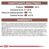 COMPOSITION : Riz, protéines de volaille déshydratées, maïs, orge, protéines animales hydrolysées, pulpe de betterave, graisses animales, substances minérales, téguments et graines de psyllium, produits de levures, mono- et diglycérides d’acides palmitique et stéarique estérifiés par l’acide citrique, huile de poissons, fructo-oligosaccharides (0,48 %), levures (source de mannan oligosaccharides), farine de tagète. Ingrédients très digestibles : 80,9 %. ADDITIFS (AU KG)** : Additifs nutritionnels : Vitamine A : 17000 UI, Vitamine D3 : 1100 UI, Vitamine E : 510 mg, Vitamine C : 260 mg, Taurine : 1,2 g, Fer (3b103) : 39 mg, Iode (3b201, 3b202) : 3,9 mg, Cuivre (3b405, 3b406) : 12 mg, Manganèse (3b502, 3b504) : 51 mg, Zinc (3b603, 3b605, 3b606) : 134 mg, Sélénium (3b801, 3b811, 3b812) : 0,07 mg - Additifs technologiques : Clinoptilolite d’origine sédimentaire : 5 g - Conservateurs - Antioxygènes.