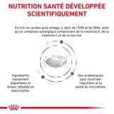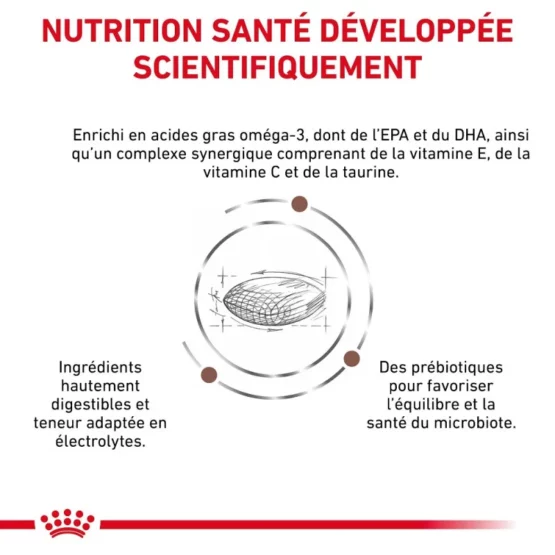 • Une combinaison de protéines hautement digestibles, de prébiotiques, de pulpe de bettrave, de riz et d’huile de poisson pour assurer une sécurité digestive maximale.