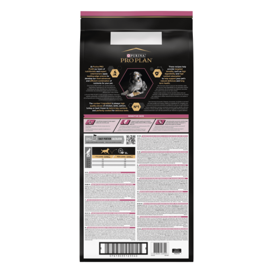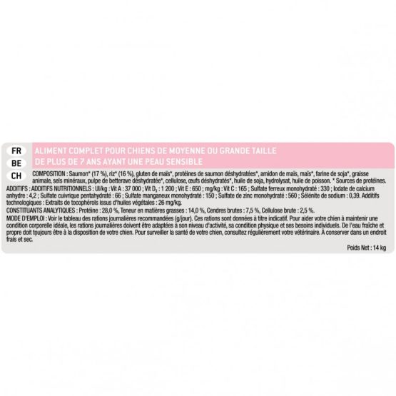 Dog Adult 7+ Medium & Large Sensitive Skin est une alimentation complète pour chien senior, avec des sources de protéines sélectionnées (saumon, maïs, soja, œuf déshydraté, riz et pulpe de betterave déshydratée). Elle contient des nutriments essentiels cliniquement prouvés pour aider à maintenir une peau saine.