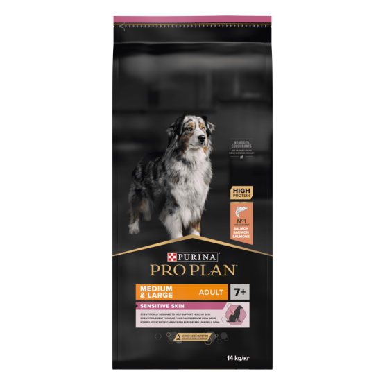 Dog Medium/Large Adult 7+ Sensitive Skin Saumon est un aliment complet pour chien senior, avec des sources de protéines sélectionnées. Contient des nutriments essentiels cliniquement prouvés pour aider à maintenir une peau saine.