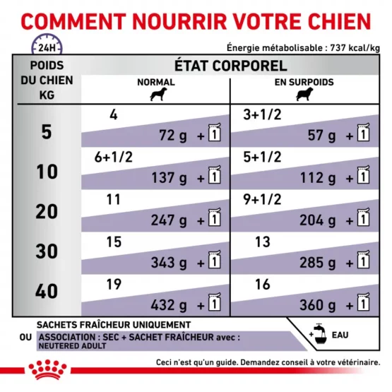 Royal Canin Neutered Adult Medium Dog est un aliment complet pour chien adulte stérilisé avec une tendance à l’embonpoint et à sensibilité cutanée.