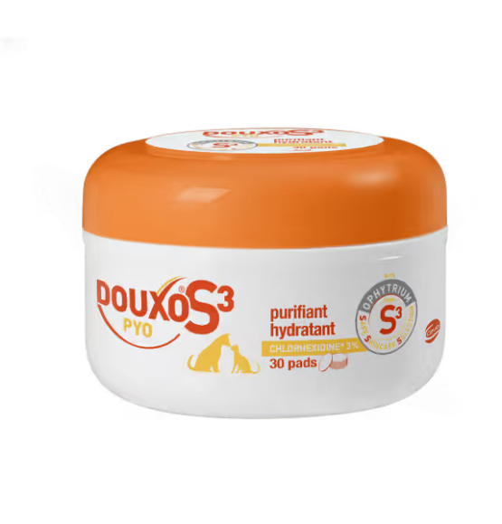• Nettoyage et désinfection des zones de pyodermites localisées, zones des plis, espaces interdigités ou pavillons auriculaires.