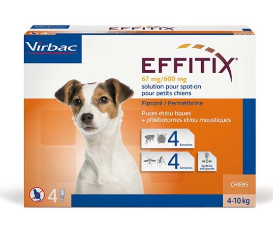 Effitix Spot On est un antiparasitaire externe à usage topique, contenant du fipronil et de la perméthrine. Cette association présente une activité insecticide, acaricide et répulsive à l’égard des phlébotomes et des moustiques.