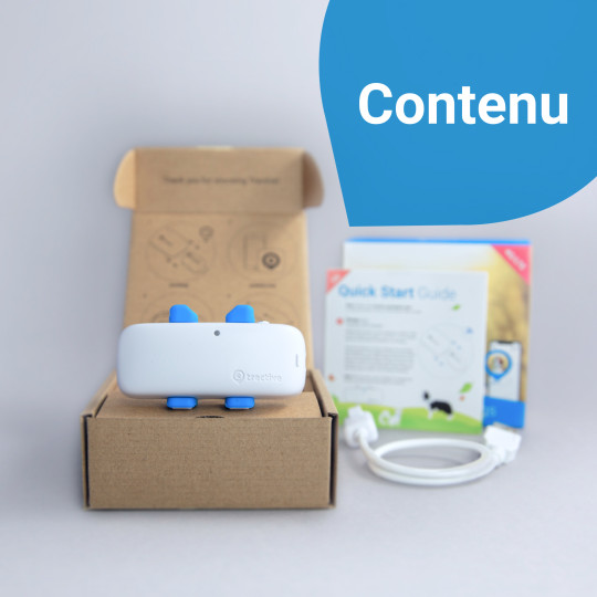 Le pack comprend : la balise GPS, un câble USB et un clip en caoutchouc pour fixation.