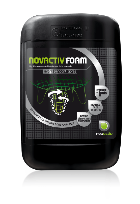 NOVACTIV® FOAM est une solution de pré-moussage idéale pour les trayons sales grâce à sa mousse haute densité qui permet une désinfection efficace.