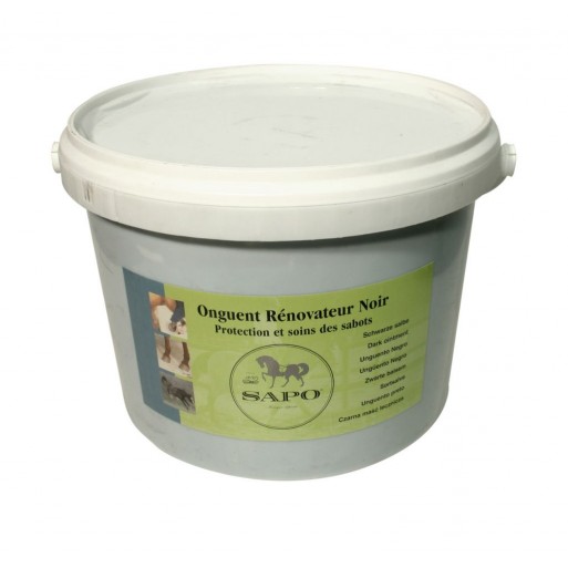 L’onguent Rénovateur Noir SAPO nourrit, assouplit et fortifie les sabots grâce à l’huile de laurier qui redonne souplesse à la corne et accroît la brillance du sabot. L’huile de foie de morue, riche en vitamine A, stimule la repousse du sabot et le goudron de pin donne au sabot cette couleur sombre tout en préservant le sabot de la pourriture de par son pouvoir désinfectant et cicatrisant. La consistance du rénovateur reste stable quelque soit la température interne du produit, c’est-à-dire qu’il est facile de prélever et d’étaler le produit à température ambiante positive comme négative.