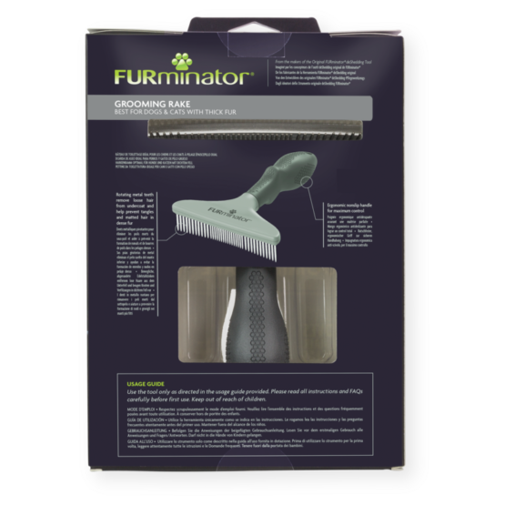 Le râteau de toilettage FURminator® élimine les poils morts du sous-poil et ses picots métalliques rotatifs aident à prévenir la formation des nœuds et des bourres de poils. Il est idéal pour les chiens et les chats au pelage dense ou à double épaisseur. La poignée ergonomique antidérapante du râteau de toilettage FURminator® offre une prise en main optimale pendant l’utilisation.
