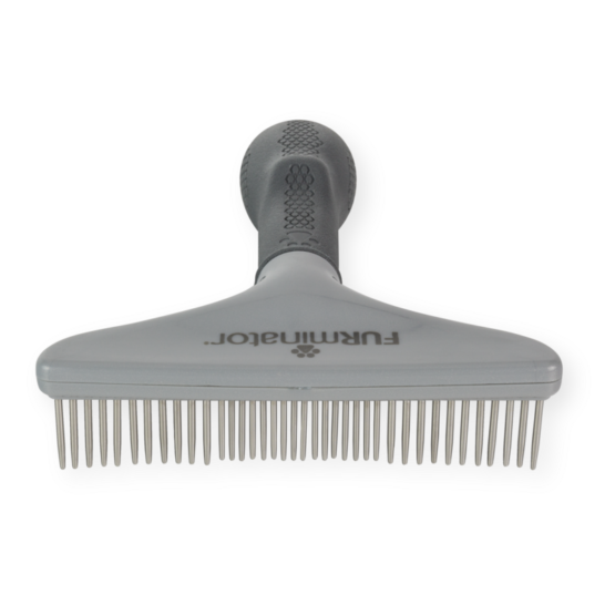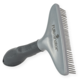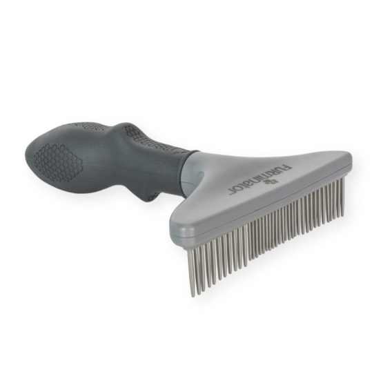 Râteau FURminator® pour les animaux au pelage épais. Il démêle, élimine les poils morts et prévient la formation des nœuds. Dents métalliques pivotantes. Poignée ergonomique antidérapante.