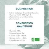 • Extrait biologique de spiruline (spirulina platensis) titré à 3000 mg/l de phycocyanine sur une base d’eau pharmacopée. La phycocyanine est extraite à froid et sans solvant ni processus thermique puis conservée dans son ampoule teintée à l’abri de l’oxygène et de la lumière