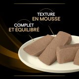Composition : Viandes et sous-produits animaux, Céréales, Œufs et produits d'œufs, Substances minérales, Huiles et graisses, Sucres, Sous-produits d'origine végétale. Sources de protéines : porc (foie, cœur), maïs, poudre d’œuf, riz, sous-produits de dinde. UI/kg : Vit D3 : 230 ; mg/kg : 3b103 : (Fe: 15) ; 3b202 : (I: 0,61) ; 3b405 : (Cu: 1,5) ; 3b503 : (Mn: 2,7) ; 3b605 : (Zn: 29) ; Taurine : 713. Constituants analytiques : Humidité : 72 %, Protéine : 6,0 %, Teneur en matières grasses : 7,2 %, Cendres brutes : 2,1 %, Cellulose brute : 0,18 %, Calcium : 0,27 %, Phosphore : 0,12 %, Potassium : 0,45 %, Sodium : 0,09 %, Acide linoléique : 1,29 %