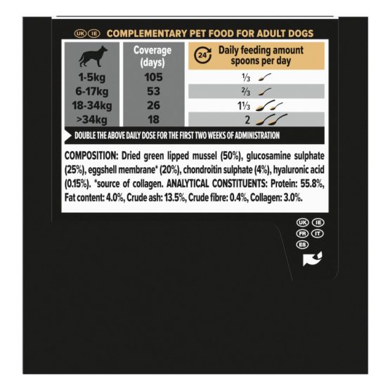 PRO PLAN® Mobility+ soutient les articulations de votre chien, grâce à une formule concentrée contenant du collagène (issu de la membrane de l’œuf), de l’acide hyaluronique (purifié), des moules vertes et de la glucosamine.