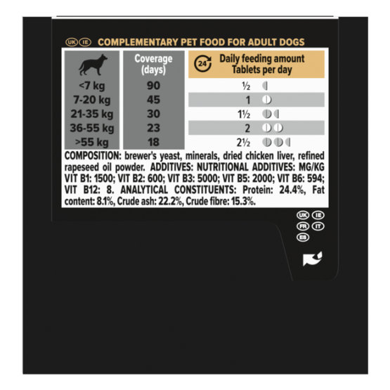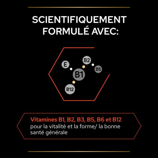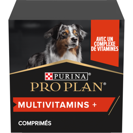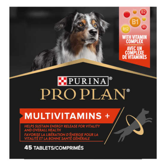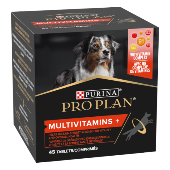 PRO PLAN® Multivitamins+ garde votre chien plein de vitalité car il contient un complexe de vitamines (vitamines B1, B2, B3, B5, B6, B12).