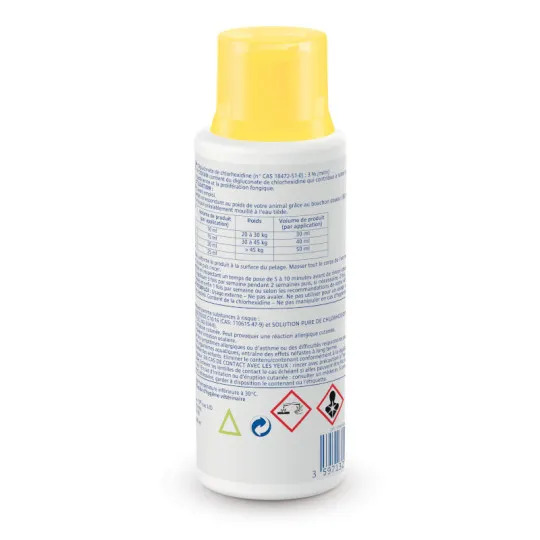 2. Mesurer la quantité correspondante au poids de votre animal grâce au bouchon doseur (30 mL) et l’appliquer sur le poil préalablement mouillé à l’eau tiède.