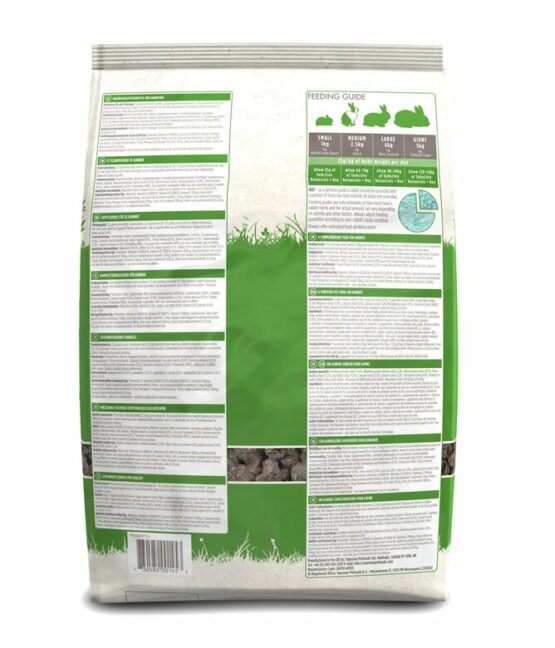 Foin de fléole des prés, Blé, Pellicules de soja, Caroubes séchées moulues, Flocons de petits pois, Tourteau de soja, Graines de lin, Huile de soja, Carbonate de calcium, Menthe séchée (0,1%), Thym séché (0,1%), Basilic séché (0,1%), Persil séché (0,1%), Pissenlit séché (0,1%), Prébiotiques (MOS), Extrait de yucca.
