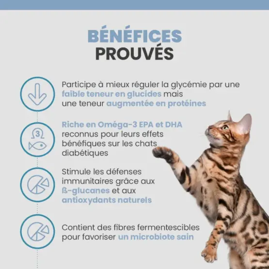 • Convient aux chats diabétiques nécessitant une alimentation adaptée pour la gestion du taux de sucre dans le sang.