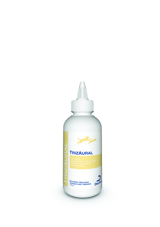 La solution TRIZAURAL, pour chien et chat, est un nettoyant auriculaire antibactérien alcalin.