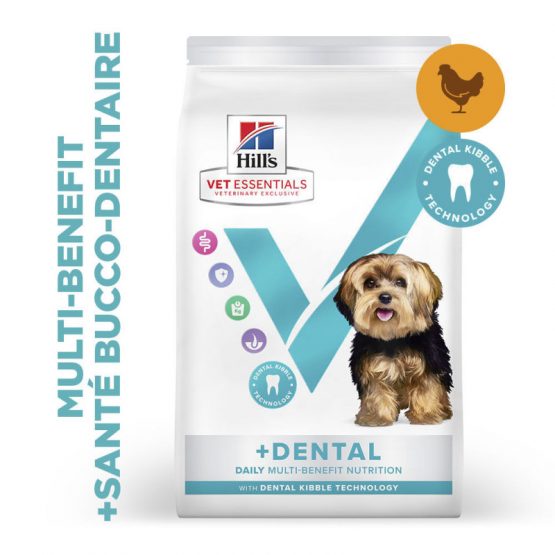 Hill’s VetEssentials Chien Multi-Benefit + Dental Adult Small & Mini Poulet est une alimentation qui aide votre chien à conserver un poids optimal, des dents propres ainsi que des articulations saines et favorise une vitalité optimale. Avec des antioxydants à l’efficacité cliniquement prouvée pour renforcer le système immunitaire.