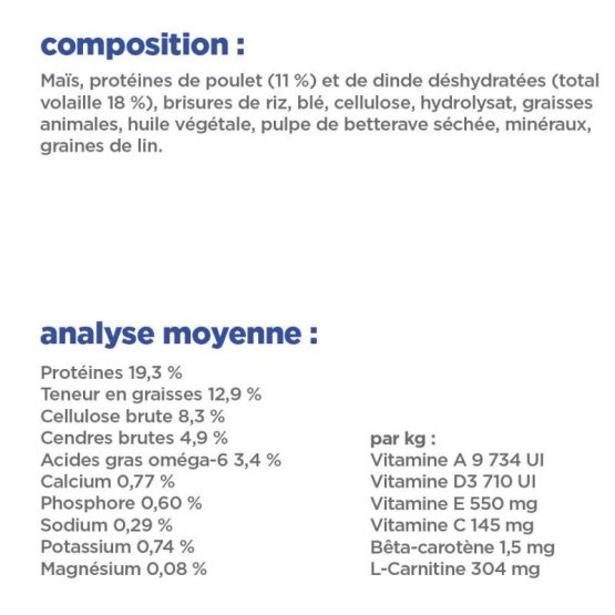 • Protéines 23,1%, Teneur en matières grasses 13,4%, Cellulose brute 8,3%, Acides gras oméga-6 3,3%, Cendres brutes 4,3%, Calcium 0,71%, Phosphore 0,56%, Sodium 0,22%, Potassium 0,65%, Magnésium 0,07%; par kg : Vitamine A 7 676 UI, Vitamine D3 609 UI, Vitamine E 690 mg, Vitamine C 110 mg, Bêta-carotène 1,5 mg, L-Carnitine 318 mg