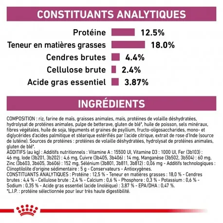 • riz, farine de maïs, graisses animales, maïs, protéines de volaille déshydratées, hydrolysat de protéines animales, pulpe de betterave, gluten de blé*, huile de poisson, sels minéraux, fibres végétales, huile de soja, téguments et graines de psyllium, fructo-oligosaccharides, mono- et diglycérides d'acides palmitique et stéarique estérifiés par l'acide citrique, extrait de rose d'Inde (source de lutéine). Sources de protéines : protéines de volaille déshydratées, hydrolysat de protéines animales, gluten de blé*.
