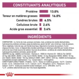 • Protéine : 13,0 % - Teneur en matières grasses : 16,0 % - Cendres brutes : 4,5 % - Cellulose brute : 2,4 % - Calcium : 0,6 % - Phosphore : 0,3 % - Potassium : 0,6 % - Sodium : 0,35 % - Acide gras essentiel (acide linoléique) : 3,4 % - EPA/DHA : 0,47 %. *L.I.P. : protéine sélectionnée pour sa très haute digestibilité