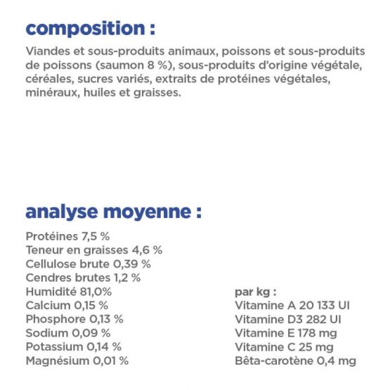 Viandes et sous-produits animaux, poissons et sous-produits de poisson (saumon 8 %), sous-produits d'origine végétale, céréales, sucres divers, extraits de protéines végétales, minéraux, huiles et graisses.