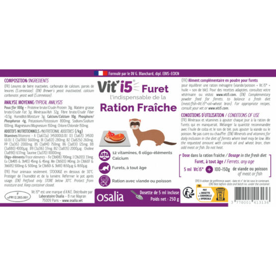 Complément alimentaire en poudre pour furet destiné à apporter minéraux et vitamines pour équilibrer une alimentation maison (viande ou poisson + Vit’i5 + huile + son de blé).