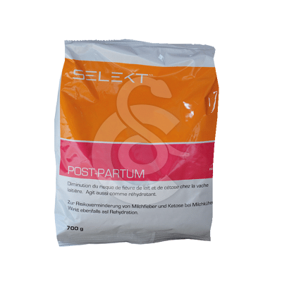 SELEKT POSTPARTUM ne contient pas de potassium pour optimiser l’absorption du magnésium. Une vache s’étant alimentée normalement jusqu’au moment du vêlage n’est pas hypo-kalièmique, l’apport de potassium n’est donc pas nécessaire. Par contre, l’apport de magnésium est important pour assurer que la vache puisse produire assez d’hormone parathyroïde qui régule la mobilisation du calcium corporel.